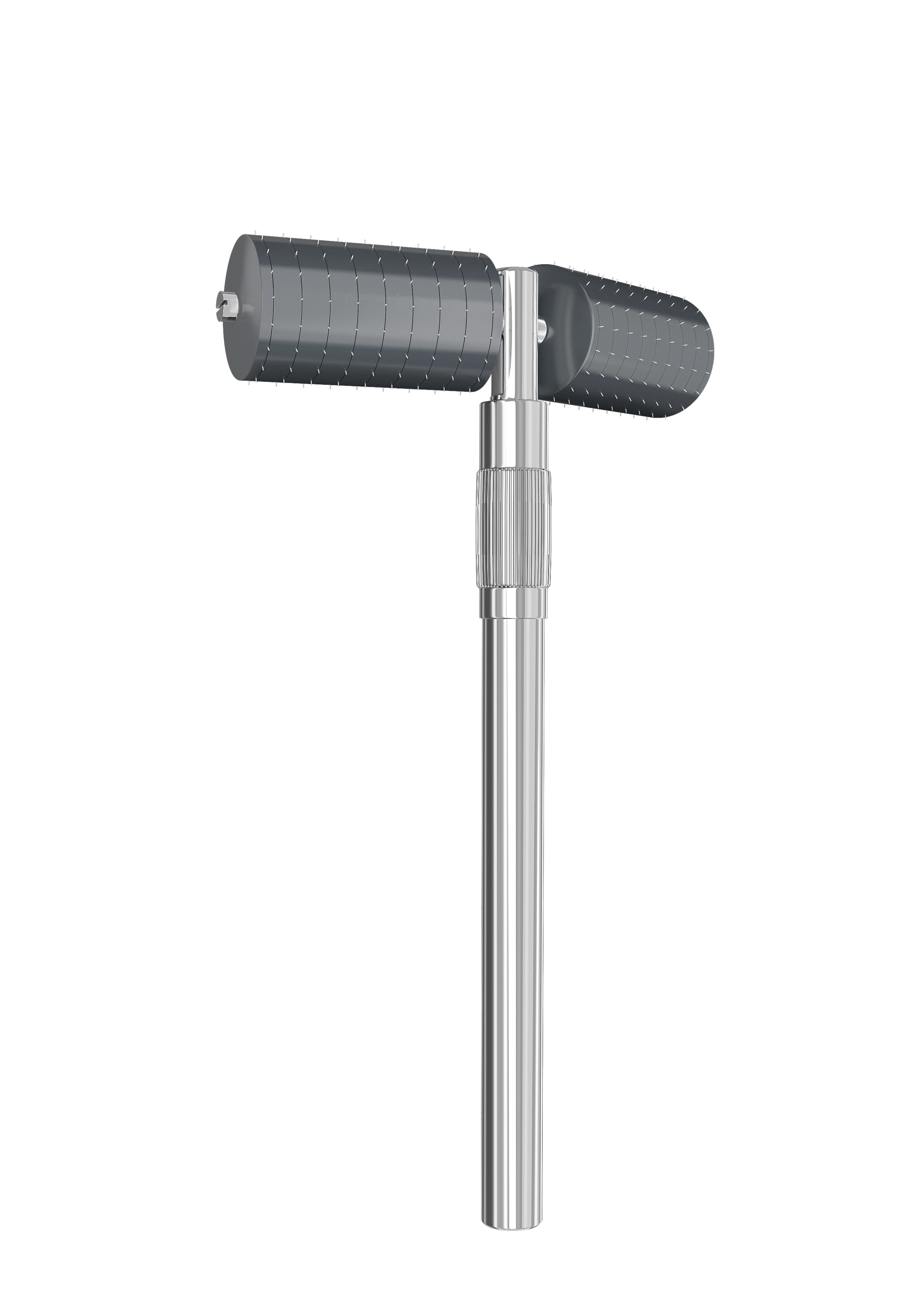 A handheld rolling device with a smooth action double roller head embedded with durable 0.1mm stainless steel micro-needles for use on the body.