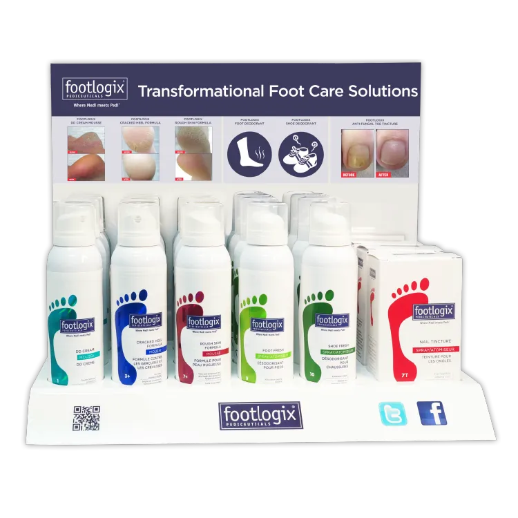 Retail the impressive Footlogix range to your clients with this attractive counter display. It includes a range of effective products from the moisturizing cracked heel formula to the refreshing foot deodorant. Recommend these pedicure products to your clients to allow them to continue their treatment at home.